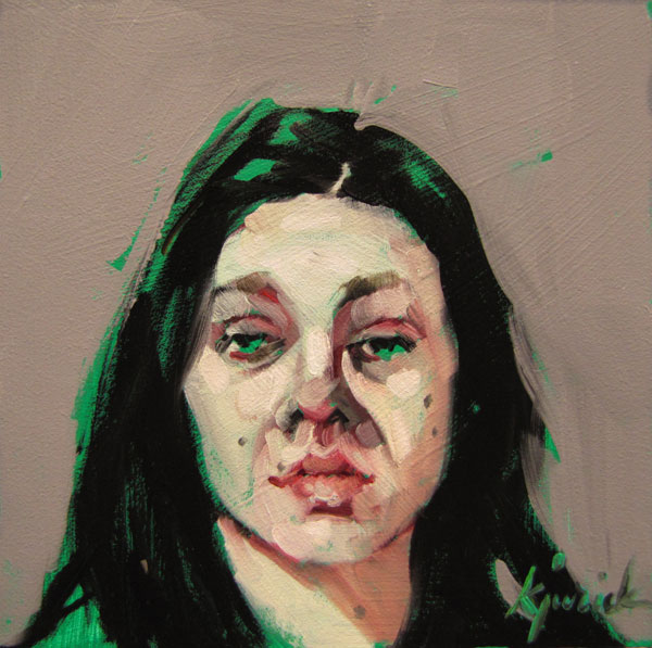 You can see the emerald-green ground color I started on - I had no plans to leave so much of it revealed, but when I got to this point, I loved it, as is. It adds a stern, somewhat graphic, somewhat of a wood-cut effect - I think it works well with the woman.